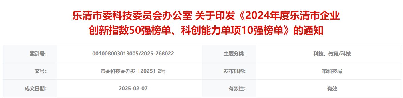 各相关单位:为进一步发挥企业创新指数激励作用,根据《关于调整<乐清市企业创新指数评价实施办法(试行)》评价指标体系的通知>(乐委科领〔2024〕1号)》,决定发布2024年度乐清市企业创新指数50强、研发投入10强、研发增长10强榜单。
