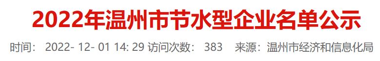 根据《温州市经济和信息化局和温州市水利局联合发文关于开展2022年节水型企业建设工作的通知》和《关于开展2022年乐清市水平衡测试项目工作的通知》(乐经信〔2022〕46)文件要求,乐清市经济和信息化局会同乐清市水利局在全市范围内开展2022年度水平衡测试审核验收工作。经企业自愿申报,经信、水利部门预审,并组织专家组审核验收,浙江朗诗德健康饮水设备股份有限公司等9家企业水平衡测审核验收合格,现予以公示。
