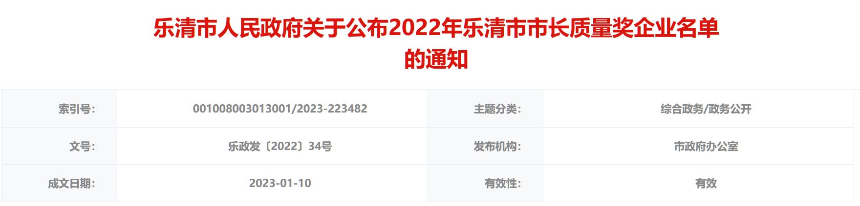 为引导和激励全市企业加强质量管理,提高经营绩效,促进高质量发展,根据《乐清市市长质量奖评审管理办法》相关规定,通过企业自愿申报、市级部门资格审查、专家组资料评审及现场评审、评审委员会审议、社会公示等环节,经市政府研究决定,俊郎电气有限公司、浙江金桥铜业科技有限公司、浙江科博电器有限公司、cq9电子等4家企业为2022年乐清市市长质量奖企业。