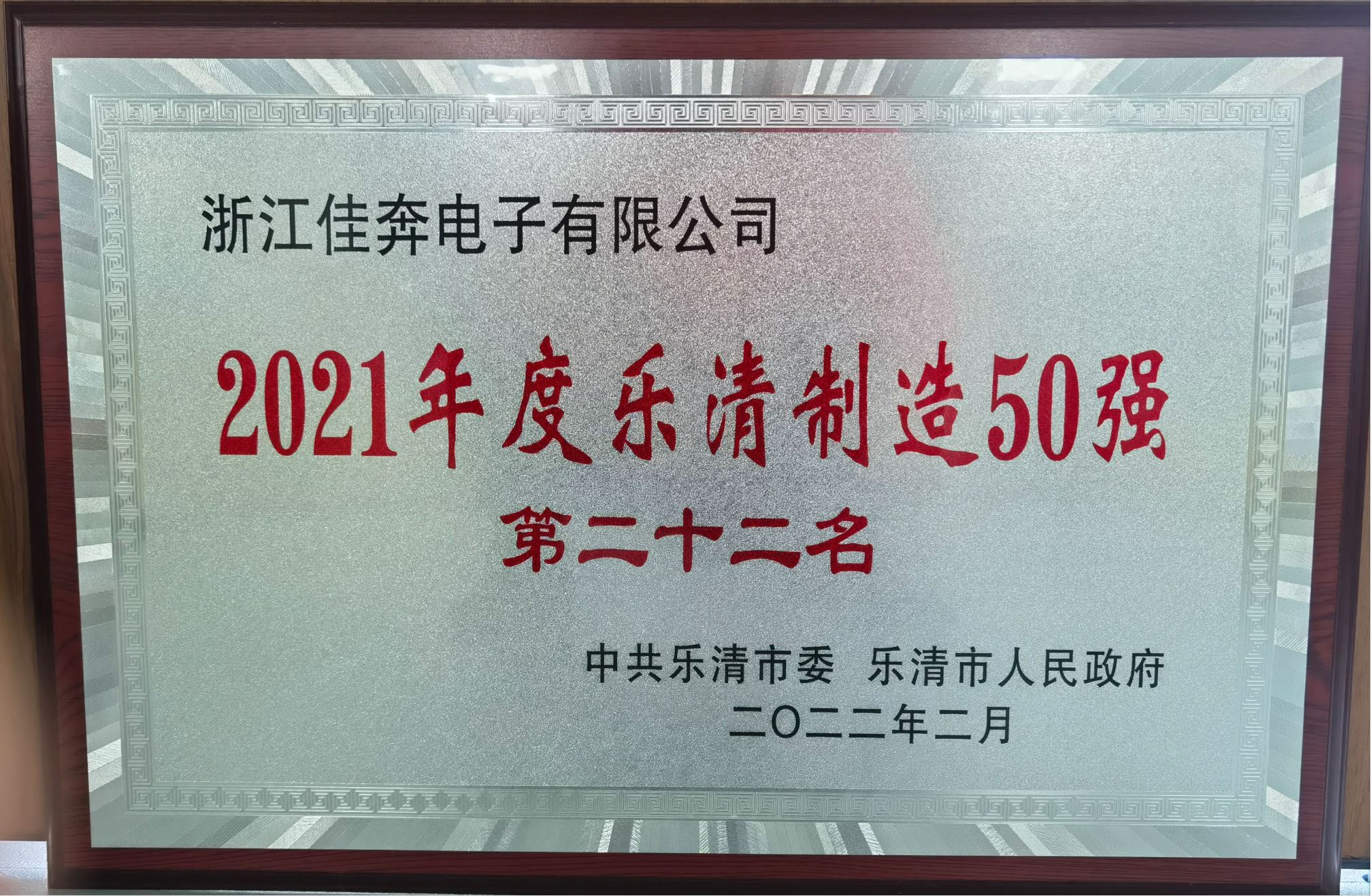 在2022年度召开的乐清市经济高质量发展大会上,公司获得“2020年乐清制造50强第22名”的荣誉奖牌,我们将再接再厉,继续努力!