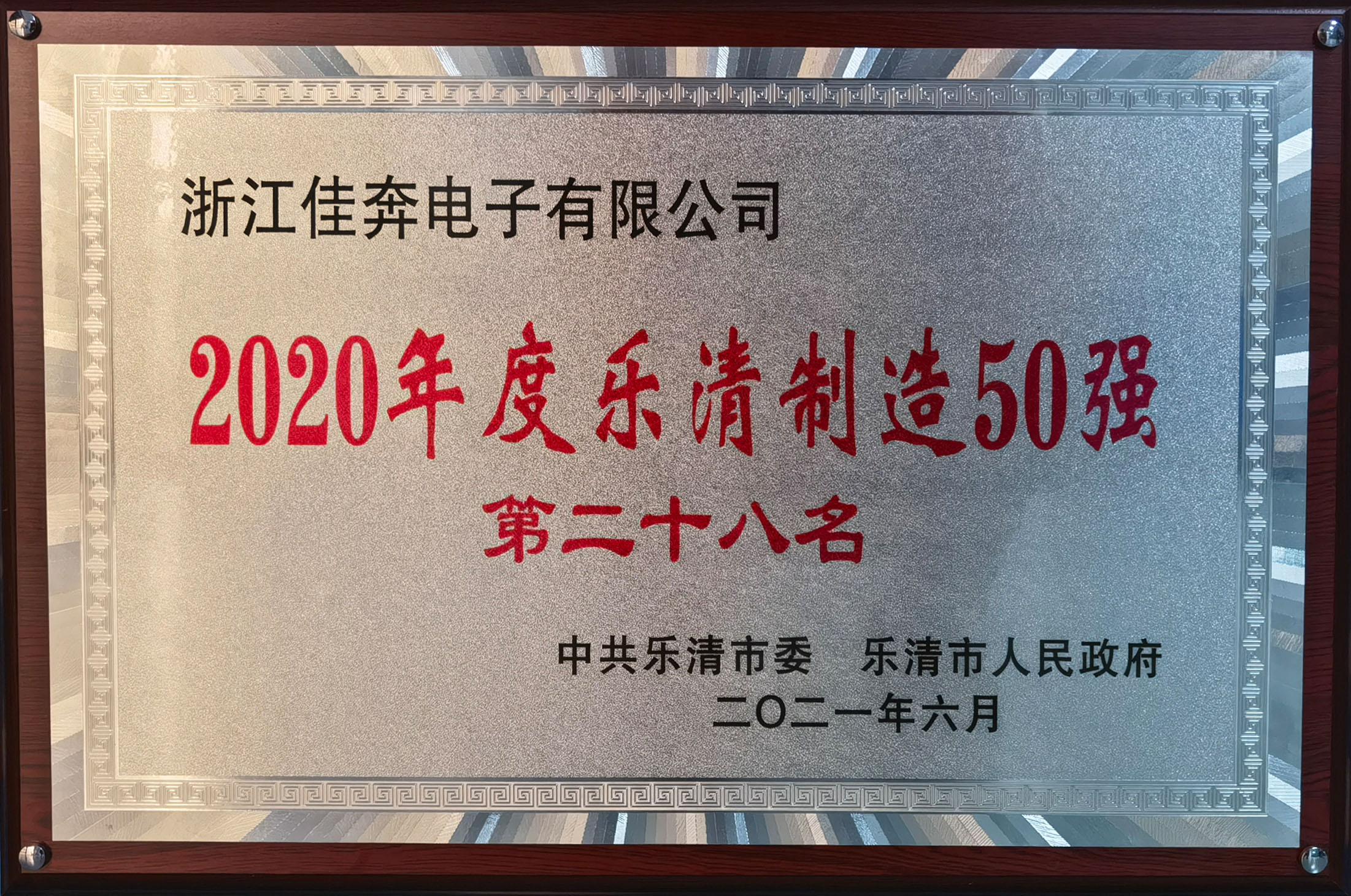 在2021年度召开的乐清市制造业高质量发展大会上,公司获得“2020年乐清制造50强第28名”荣誉奖牌,我们将再接再厉,继续努力!